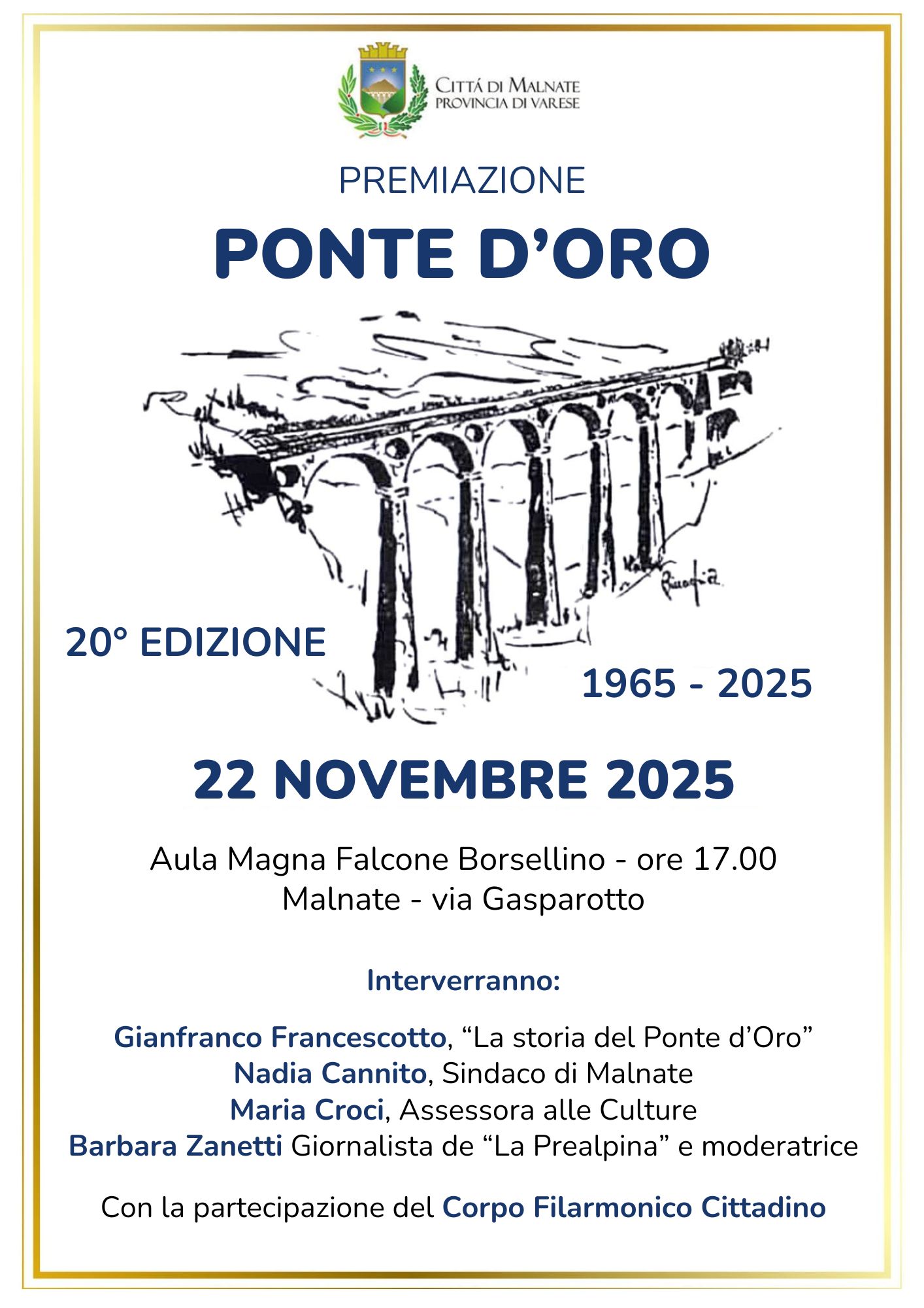 20° Edizione del Premio “Ponte d’Oro”, sabato 22novembre 2025, alle ore 17.00, presso l’Aula Magna “G. Falcone e P. Borsellino” della Scuola Secondaria di Primo Grado “N. Sauro” (ingresso di via Gasparotto, Malnate).