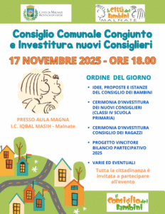 E’ convocato il Consiglio comunale congiunto, Consiglio dei Bambini e Consiglio dei Ragazzi presso l’Aula Magna Falcone e Borsellino il giorno lunedì 17 novembre 2025 alle ore 18.00 in sessione ordinaria.