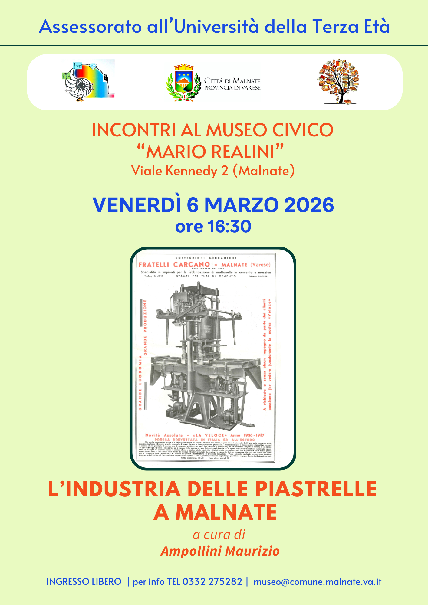L’INDUSTRIA DELLE PIASTRELLE A MALNATE a cura di Maurizio Ampollini Venerdi 6 Marzo 2026 ore 16.30 Museo Civico di Scienze Naturali M. Realini Ingresso libero