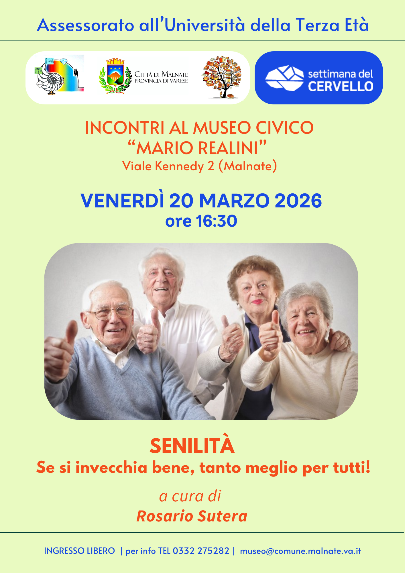 Venerdì 20 Marzo 2026 ore 16.30 Senilità: se si invecchia bene, tanto meglio per tutti , a cura di Rosario Sutera |