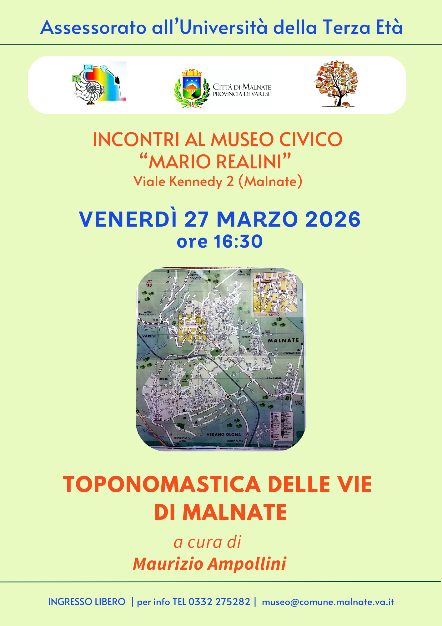 Venerdì 27 Marzo 2026 ore 16.30 Toponomastica delle vie di Malnate, a cura di Maurizio Ampollini |
