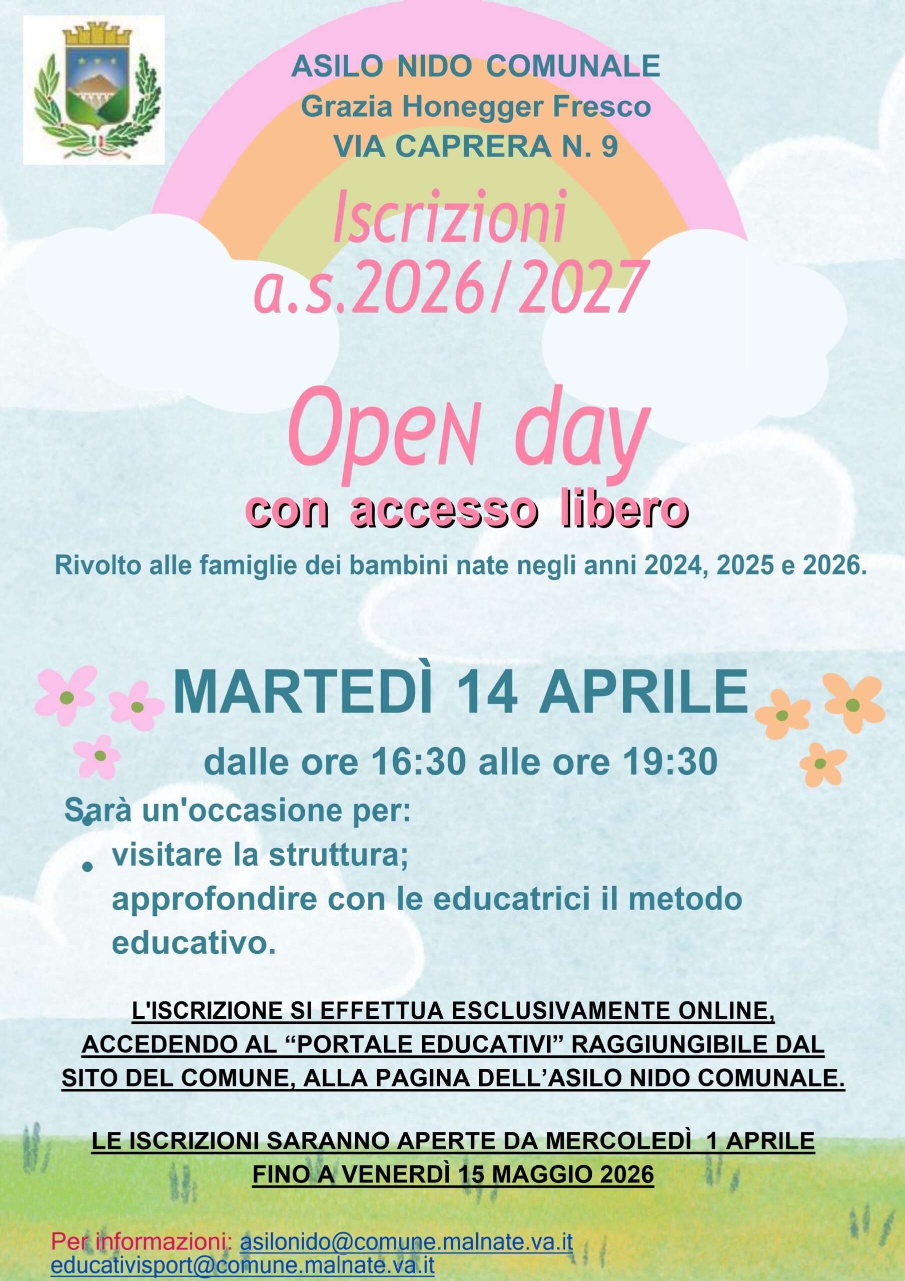 Martedì 14 aprile 2026, dalle ore 16:30 alle ore 19:30, si terrà l’open day presso l’Asilo nido comunale sito in via Caprera, n. 9.