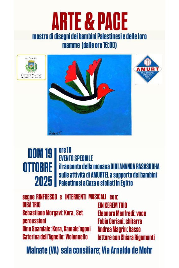 - dalle ore 18.00 Evento speciale il racconto della monaca Didi Ananda Rasasudha sulle attività di Amurtel a supporto dei bambini Palestinesi a Gaza e sfollati in Egitto