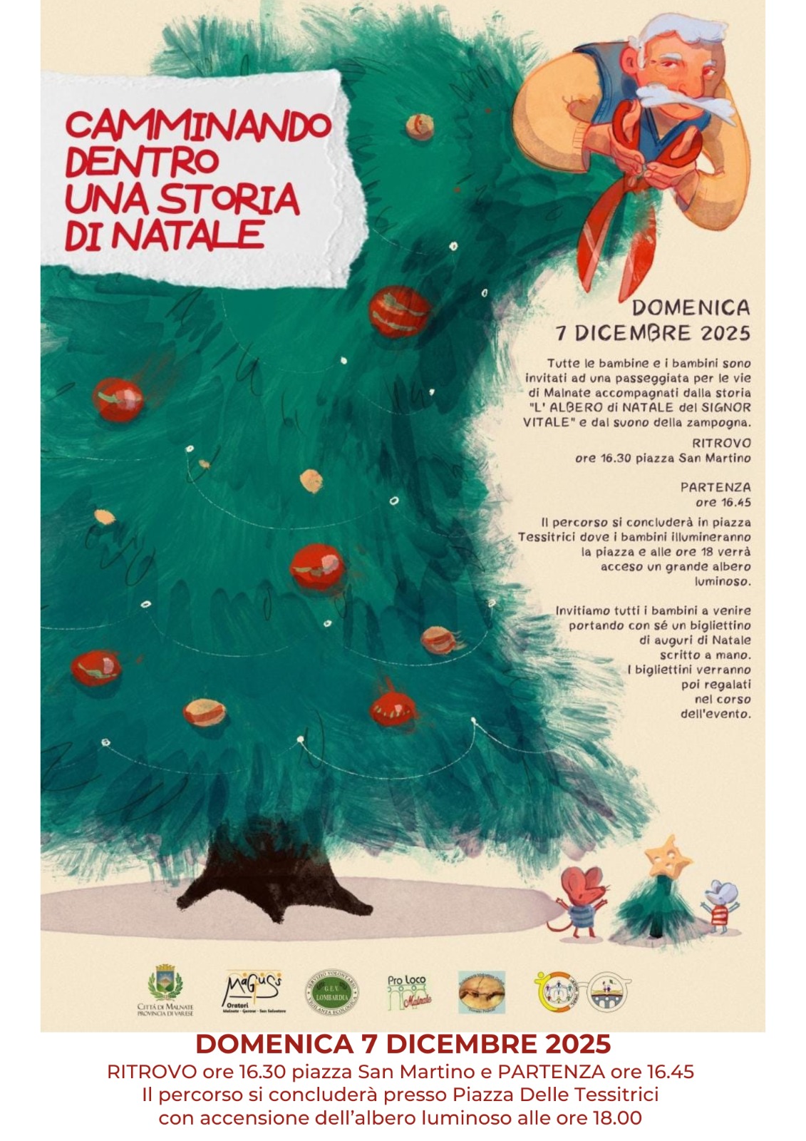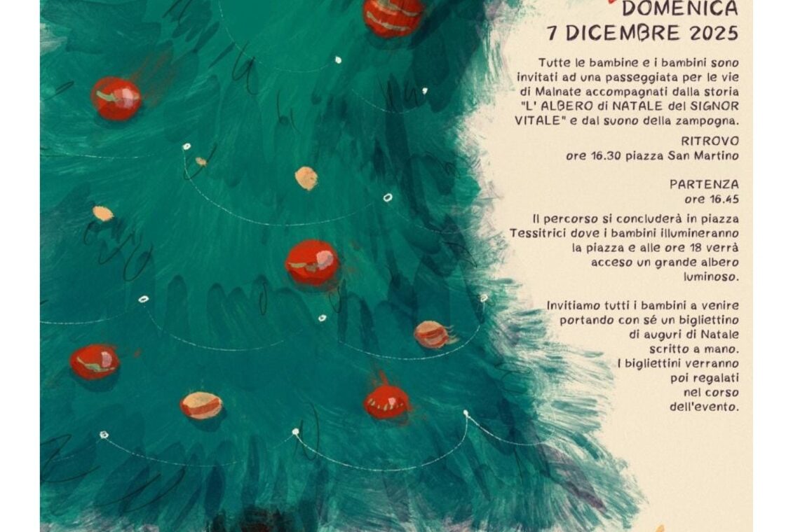Tutte le bambine e i bambini sono invitati a una passeggiata per le vie di Malnate, accompagnati dalla storia “L’albero di Natale del Signor Vitale” e dal suono della zampogna.