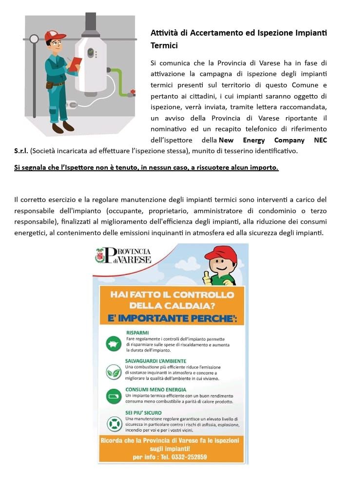 Si comunica che la Provincia di Varese ha in fase di attivazione la campagna di ispezione degli impianti termici presenti sul territorio di questo Comune e pertanto ai cittadini, i cui impianti saranno oggetto di ispezione, verrà inviata, tramite lettera raccomandata, un avviso della Provincia di Varese riportante il nominativo ed un recapito telefonico di riferimento dell’ispettore della New Energy Company NEC s.r.l. (Società incaricata ad effettuare l’ispezione stessa), munito di tesserino identificativo.