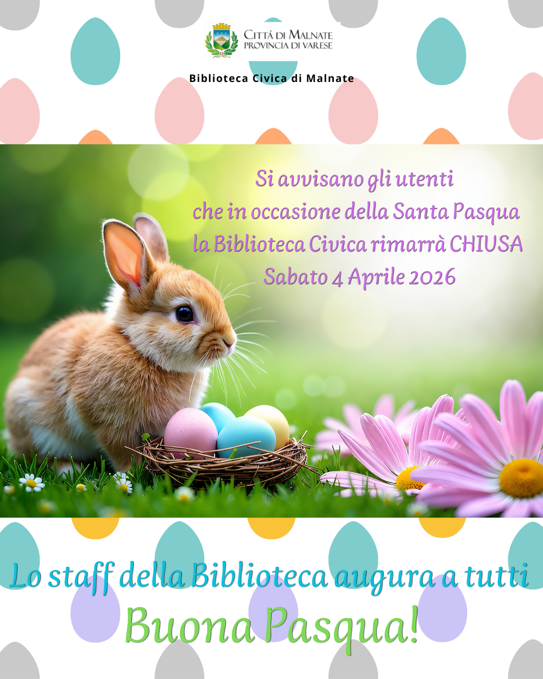 Si avvisano gli utenti che in occasione della Santa Pasqua la Biblioteca Civica rimarrà chiusa Sabato 4 Aprile 2026.