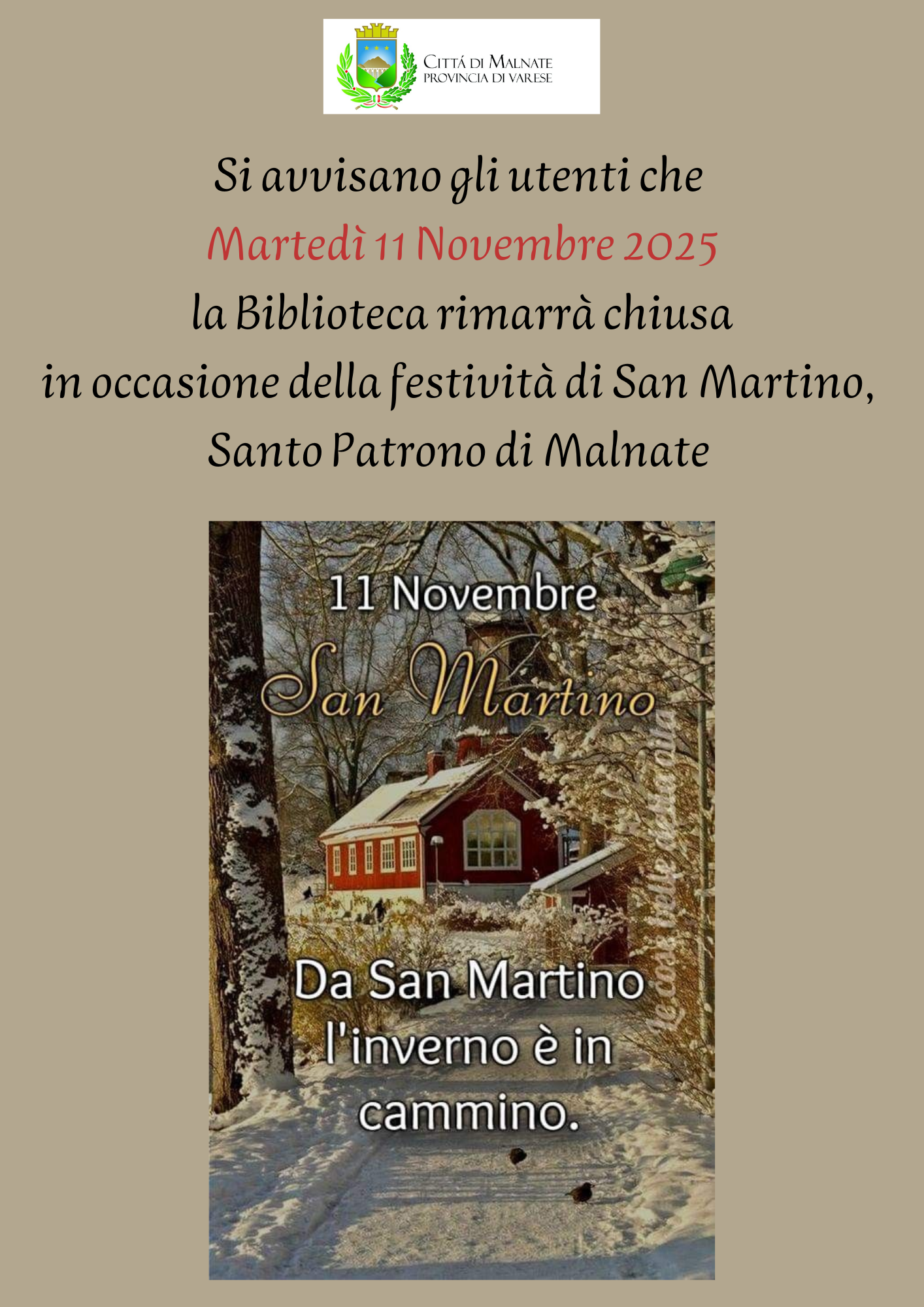 Si avvisano gli utenti che Martedì 11 Novembre 2025 la Biblioteca rimarrà chiusa in occasione della festività di San Martino, Santo Patrono di Malnate.