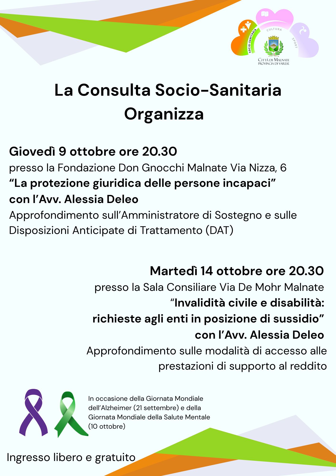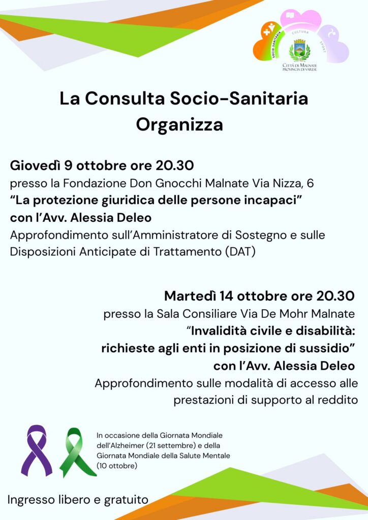 Giovedì 9 Ottobre 2025 ore 20.30 presso la Sala Consiliare (via De Mohr, Malnate) “La protezione giuridica delle persone incapaci”Approfondimenti sull’Amministratore di Sostegno e sulle disposizioni anticipate di trattamento (DAT) |