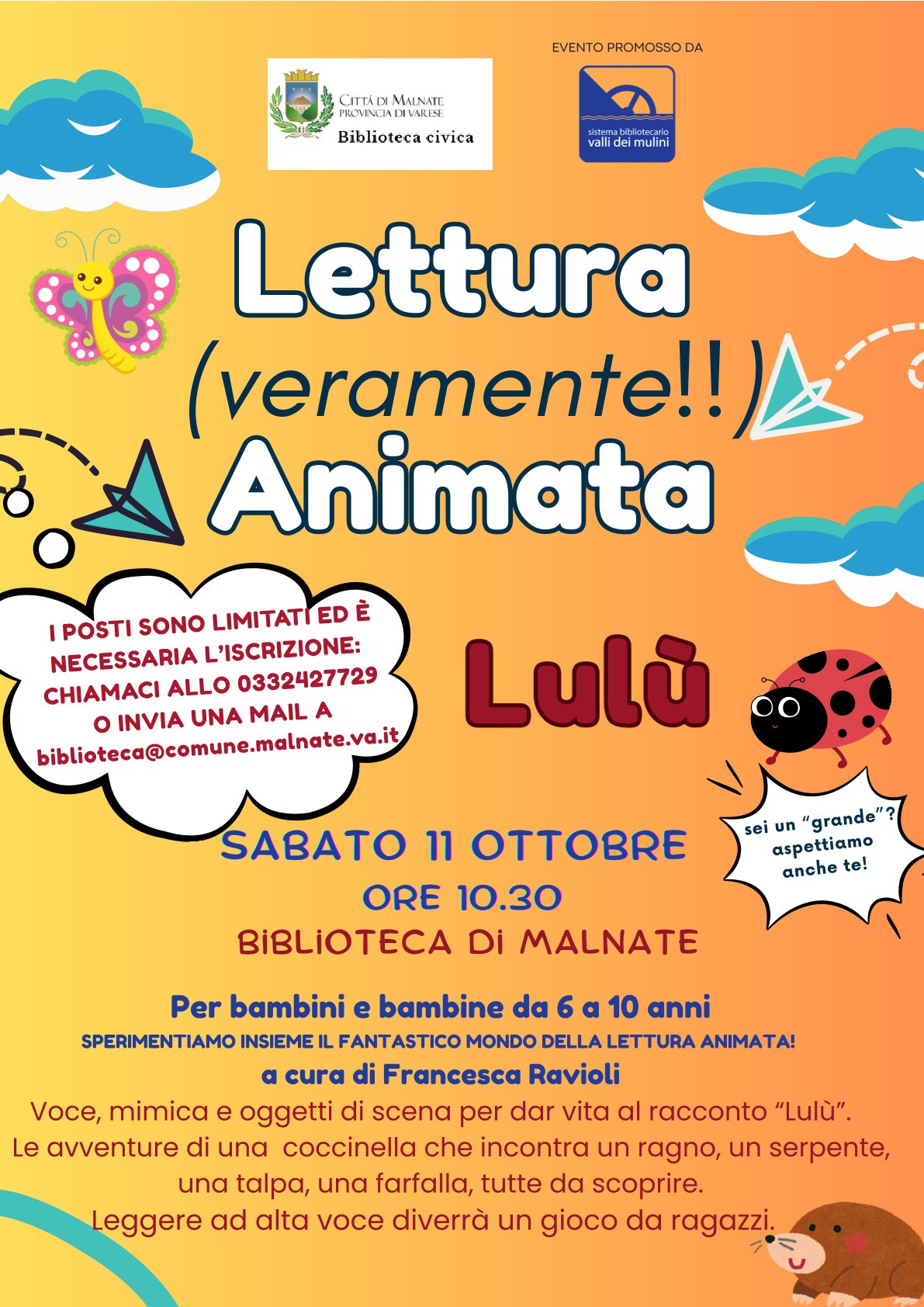 Voce, mimica e oggetti di scena per dar vita al racconto “Lulù”. Le avventure di una coccinella che incontra un ragno, un serpente, una talpa, una farfalla, tutte da scoprire. Leggere ad alta voce diverrà un gioco da ragazzi.
