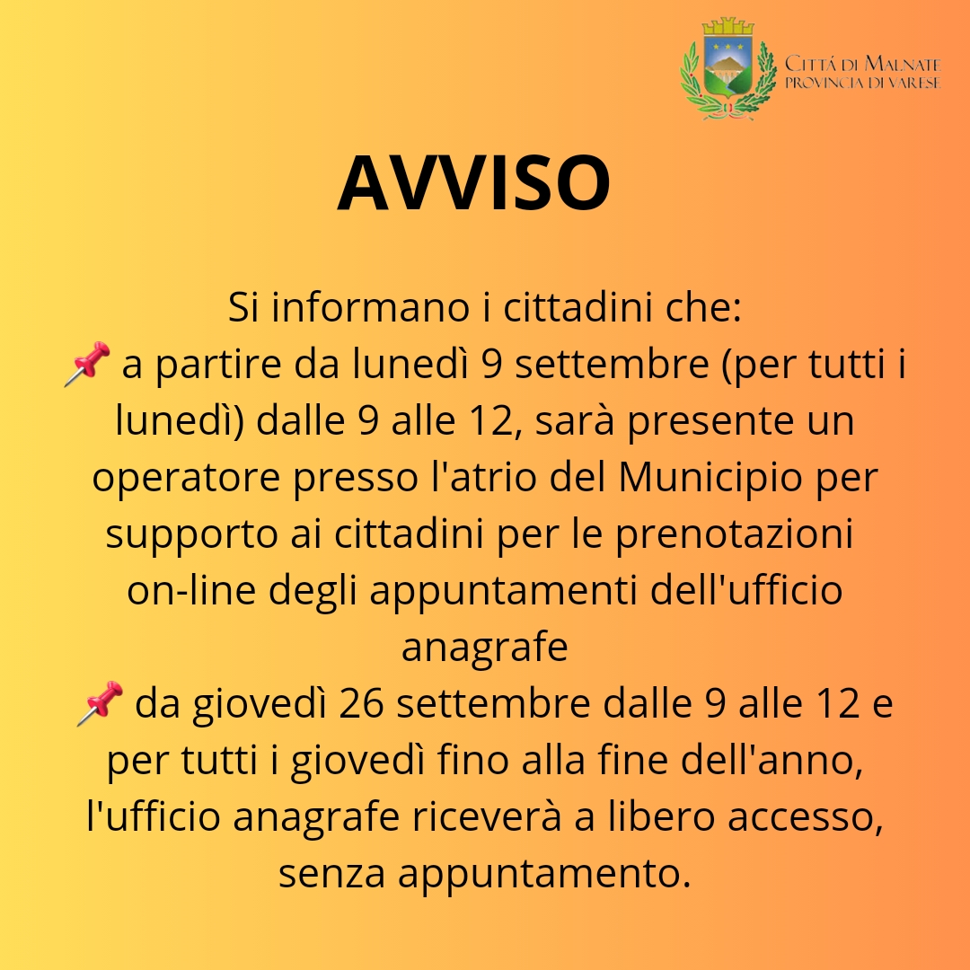 A partire da lunedì 9 settembre 2024 (per tutti i lunedì) dalle ore 9.00 alle ore 12.00 , sarà presente un operatore presso l’atrio del Municipio per supporto ai cittadini per le prenotazioni on-line degli appuntamenti dell’ufficio anagrafe.