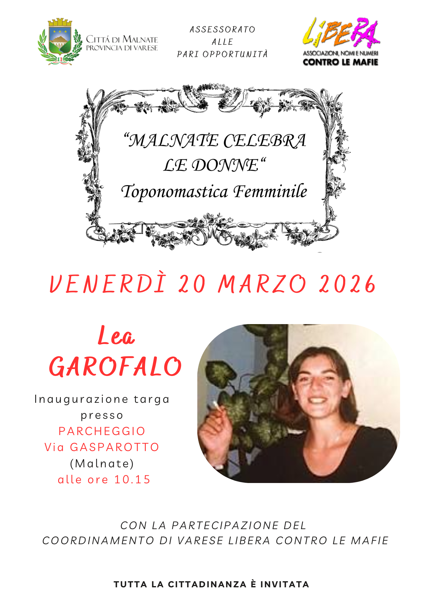 Inaugurazione targa dedicata a Lea GAROFALO presso PARCHEGGIO Via GASPAROTTO (Malnate) alle ore 10.15 |
