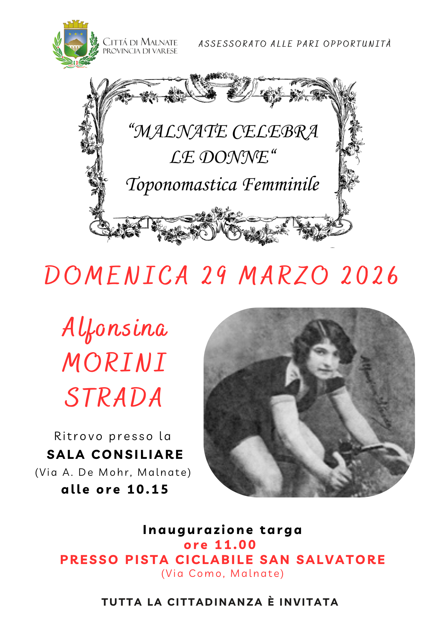Inaugurazione targa dedicata a Alfonsina MORINI STRADA Ritrovo presso la SALA CONSILIARE (Via A. De Mohr, Malnate) alle ore 10.15 A seguire inaugurazione alle ore 11.00 PRESSO PISTA CICLABILE SAN SALVATORE (Via Como, Malnate)