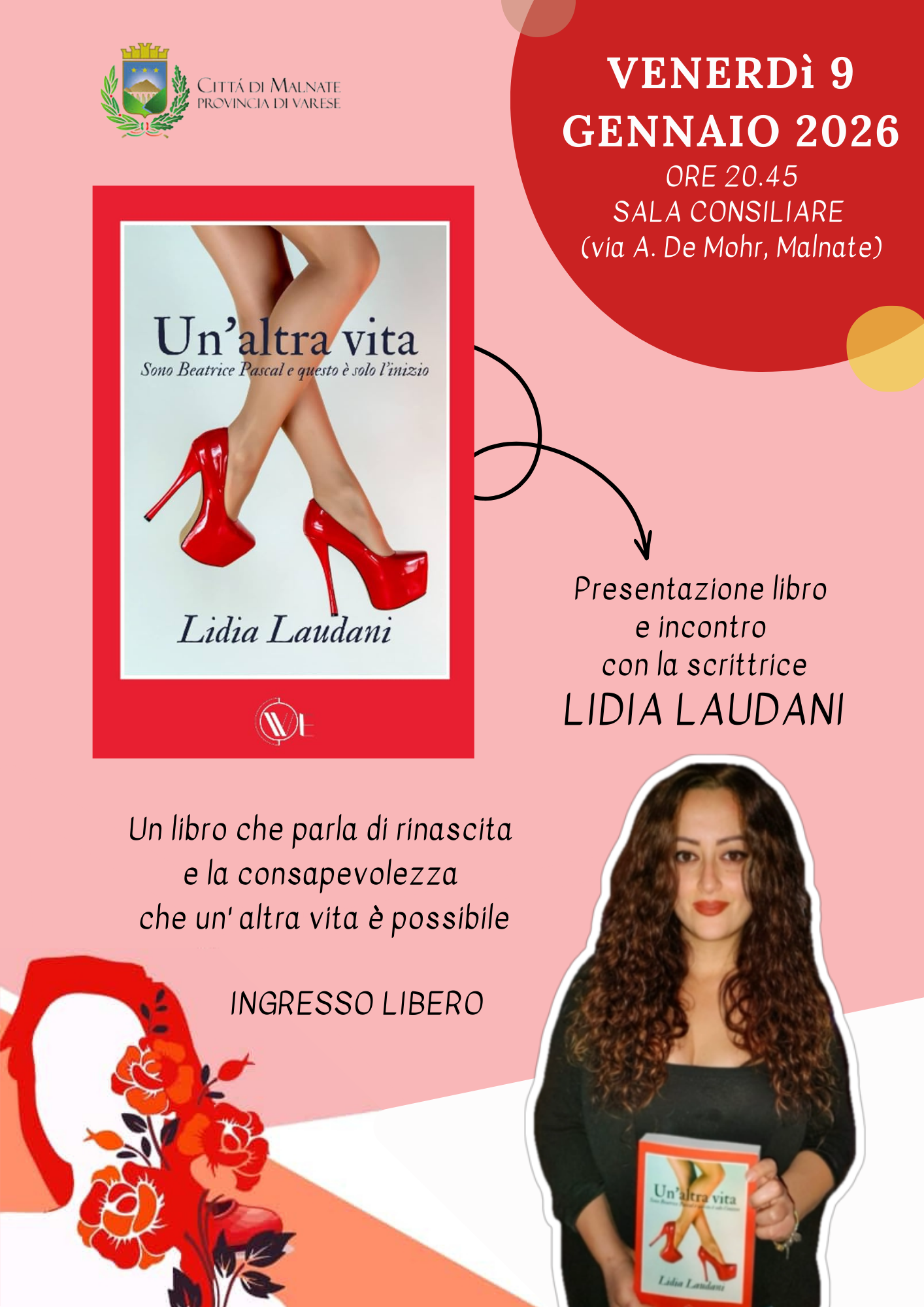 Presentazione libro e incontro con la scrittrice Lidia Laudani: “Un’altra vita. Sono Beatrice Pascal e questo è solo l’inizio” VENERDì 9 GENNAIO 2026 ORE 20.45 SALA CONSILIARE (via A. De Mohr, Malnate) Ingresso Libero